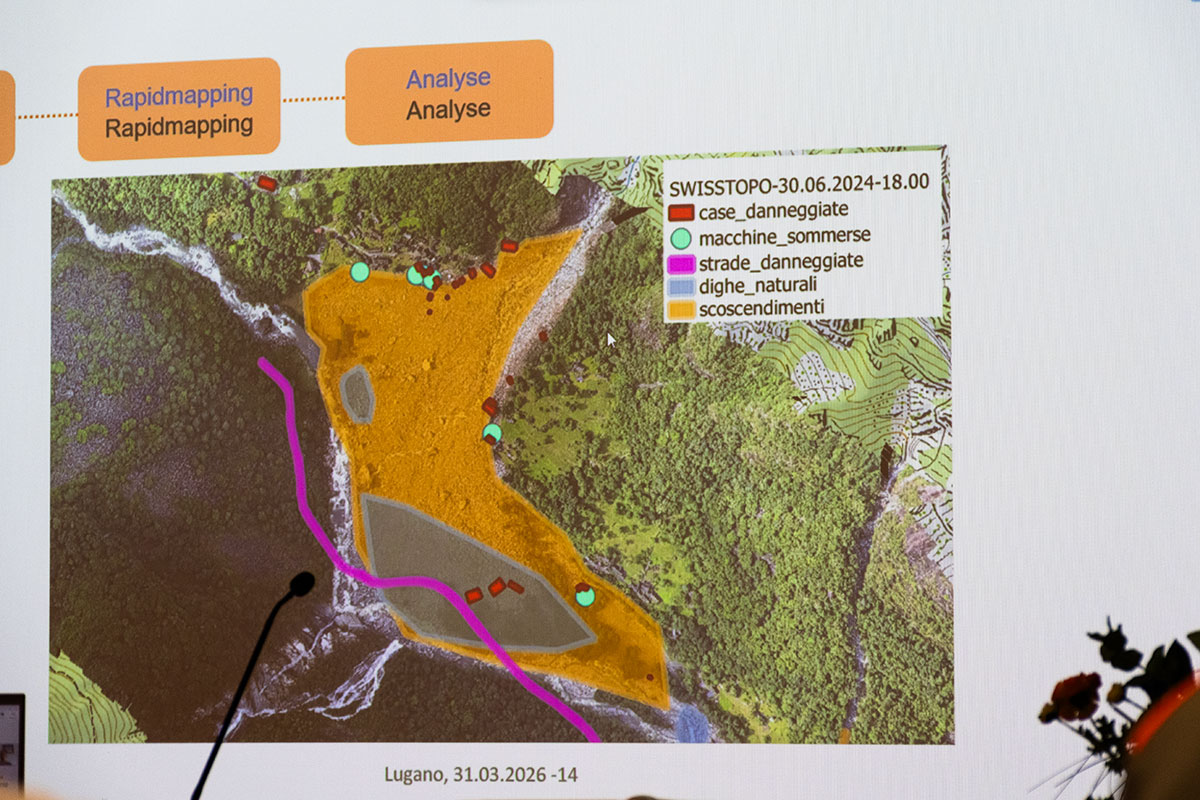 Eleonora Pedrini-Pedroli, aktuelle Zivilschützerin des Jahres, stellte danach per Videocall die Vorzüge des Systems «Rapid Mapping» von swisstopo vor, welches nach dem Unwetter im Maggiatal Ende Juni 2024 enorme Dienste leistete. Der Zivilschutz Locarno und Vallemaggia konnte bezüglich Lageanalyse und Führungsunterstützung enorm von diesem System und von ihrem Know-how profitieren, musste er doch zu Beginn quasi «blind» agieren, weil lediglich erste Bilder vom Helikopter vorlagen. Bereits in den ersten Stunden nach Ausbruck des Ereignisses in der Nacht auf den 30. Juni koordinierte Eleonora Pedrini-Pedroli die Arbeiten im Regionalen Führungsstab, speziell im Bereich «Rapid Mapping», und sorgte so für eine Echtzeitdarstellung des Ereignisses, die bei der weiteren Arbeit elementar war. Aufgrund der Flugbilder von «Rapid Mapping» lagen schon nach 12 Stunden gute Informationen darüber vor, was konkret geschehen war. Sie untermalte ihre Schilderungen mit eindrücklichen Bildern und Darstellungen.
