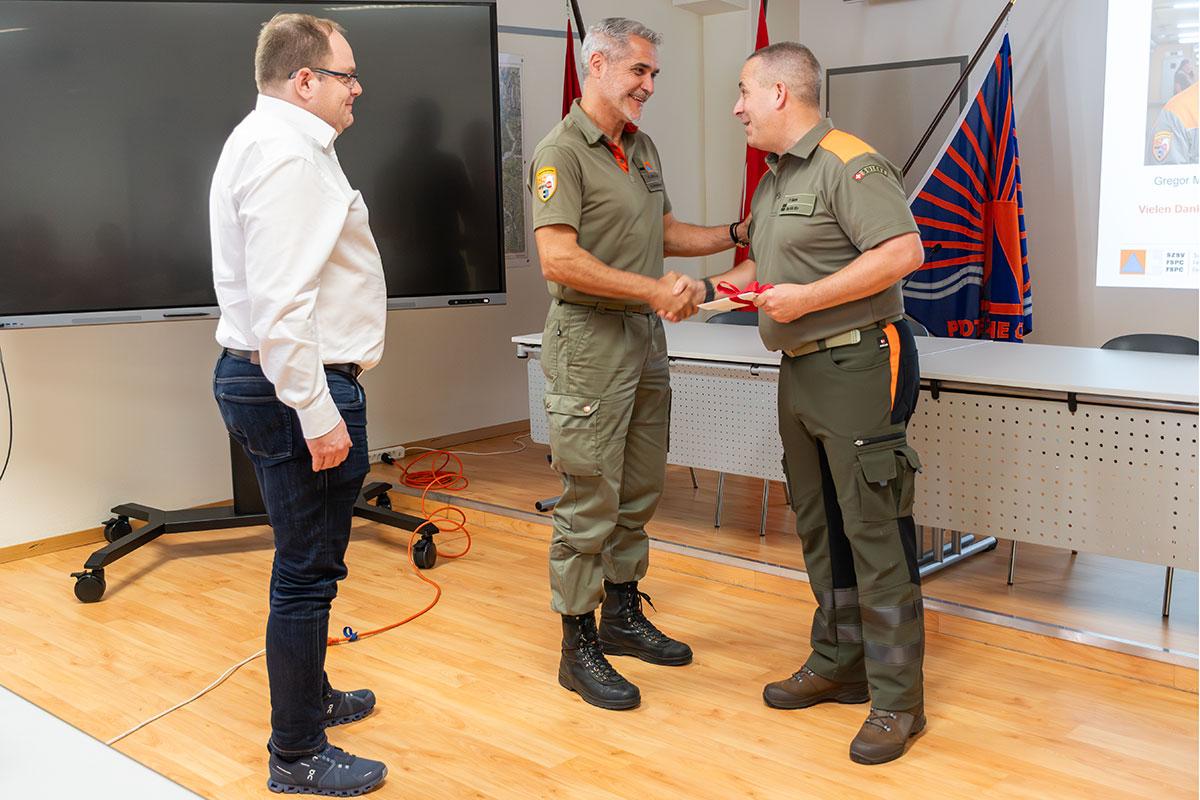 Nachdem die beiden Co-Präsidenten der KoKo ein überaus positives Fazit der Konferenz gezogen hatten und darin vom Plenum bestärkt wurden, wurde es emotional: Gregor Müller wurde von Patrick Sauzet und Frédéric Voirol mit Präsenten und Worten des Dankes für seine grossen, jahrzehntelangen Leistungen für den Zivilschutz in den Ruhestand verabschiedet. «Es ist bezeichnend», sagte Sauzet, «dass Gregor seinen allerletzten Arbeitstag bei uns in der KoKo verbracht hat.»